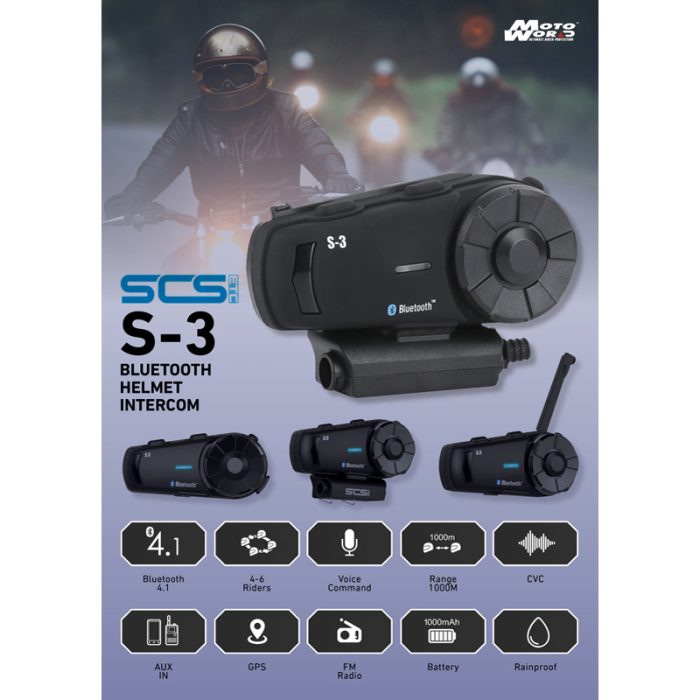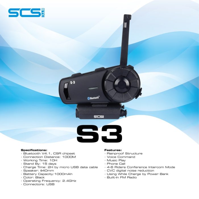 - The SCS S3 is designed for ease of use with enhanced intercom connectivity. Take your crew on the road, and enjoy intercom connectivity between rider and pillion or between 6-8 riders at a distance of 1000m.